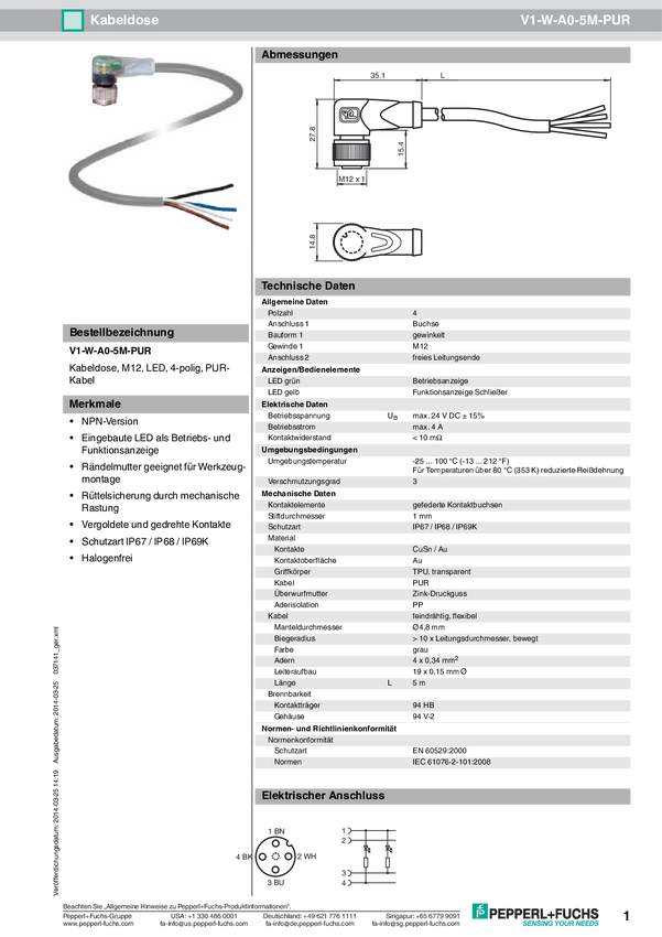 Pepperl+Fuchs 037141 Gniazdo kablowe V1-W-A0-5M-PUR, piny: 4, 5.00 m, 1 szt.