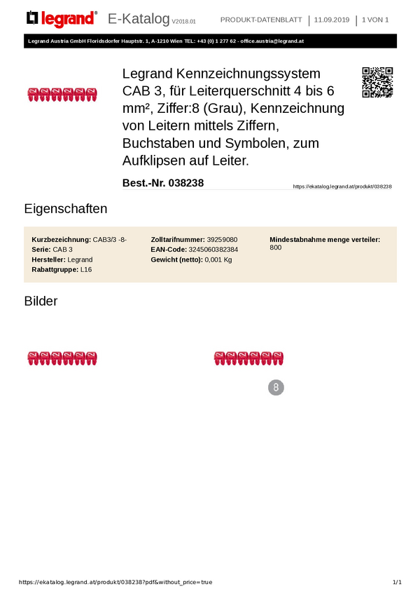 Legrand Legrand 038238 Oznacznik kablowy Nadruk 8 Zakres średnicy zewnętrznej 3.80 do 5 mm 038238