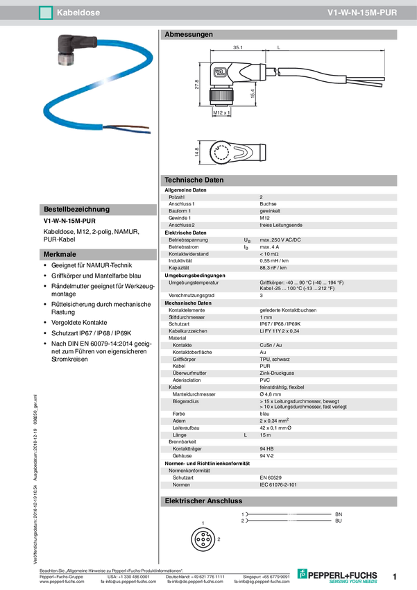 Pepperl+Fuchs 038250 Gniazdo kablowe V1-W-N-15M-PUR, piny: 2, 15.00 m, 1 szt.