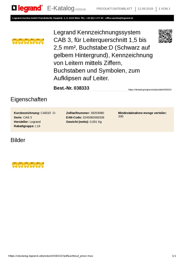 Legrand Legrand 038333 Oznacznik kablowy Nadruk D Zakres średnicy zewnętrznej 2.70 do 3.90 mm 038333