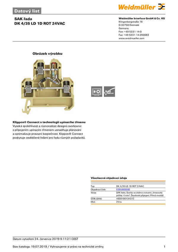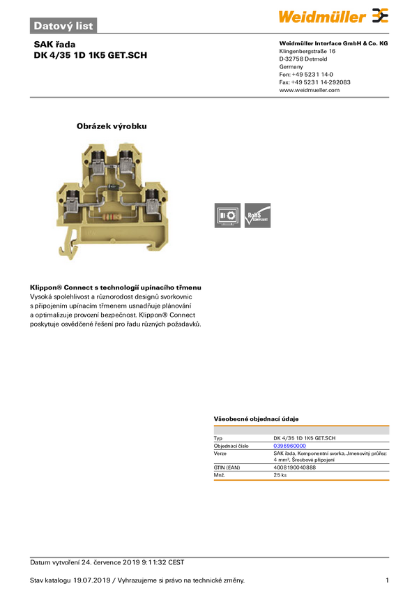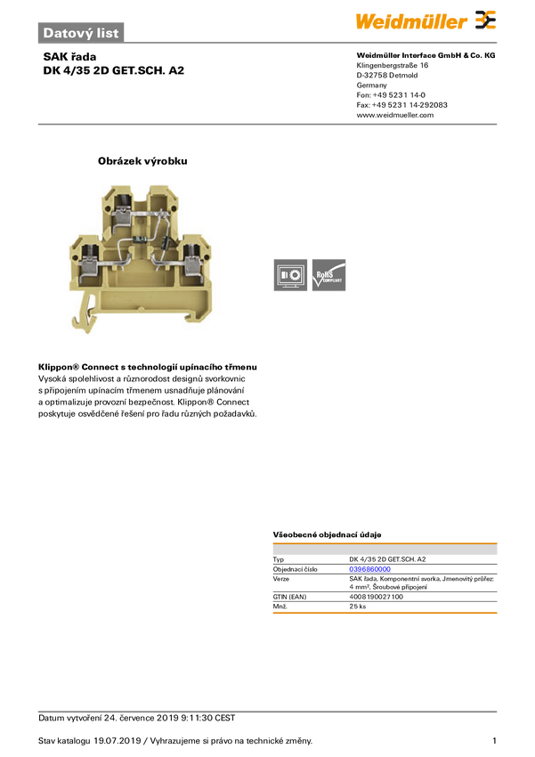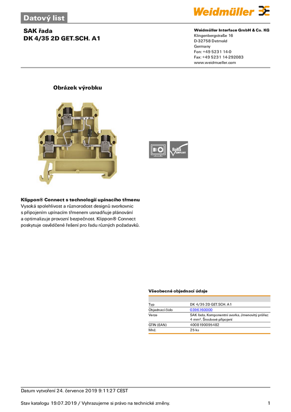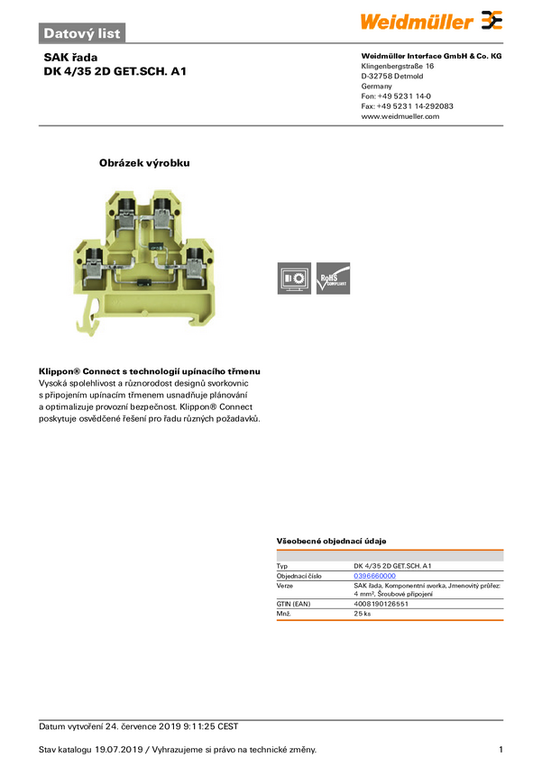 Seria SAK, Podzespół listwy rzędowej, Przekrój pomiarowy: 4 mm², złącze śrubowe, DK 4/35 1D GET.SCH. 0396360000 beżowy,
