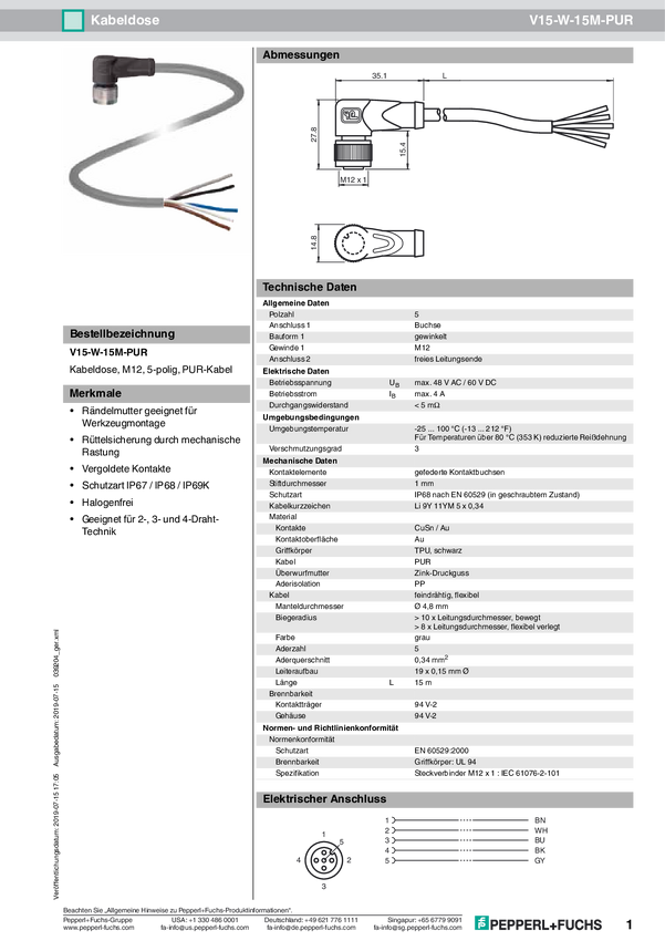 Pepperl+Fuchs 039204 Gniazdo kablowe V15-W-15M-PUR, piny: 5, 15.00 m, 1 szt.