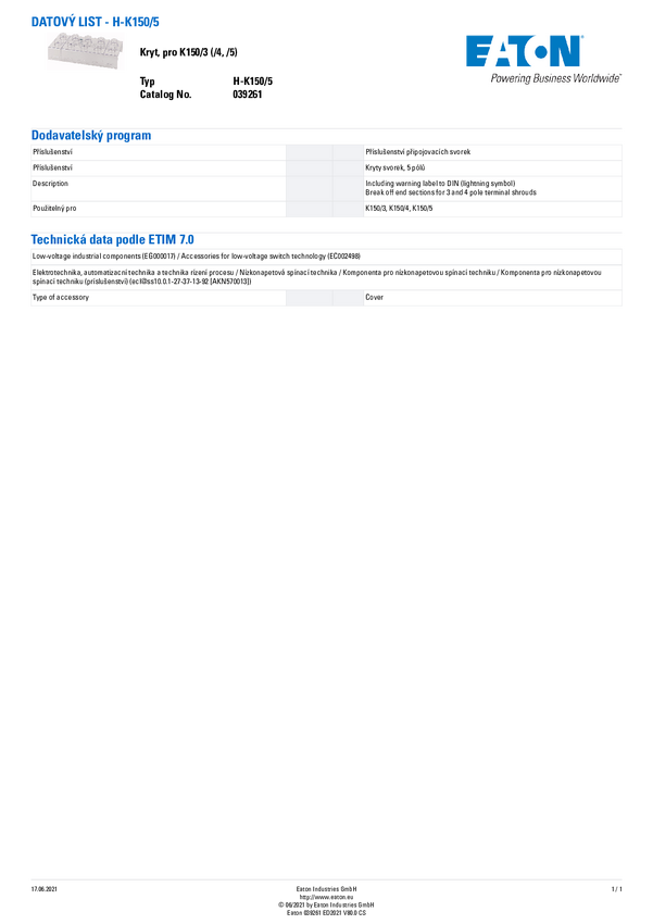 Eaton 039261 Pokrywa zacisków 1 szt.