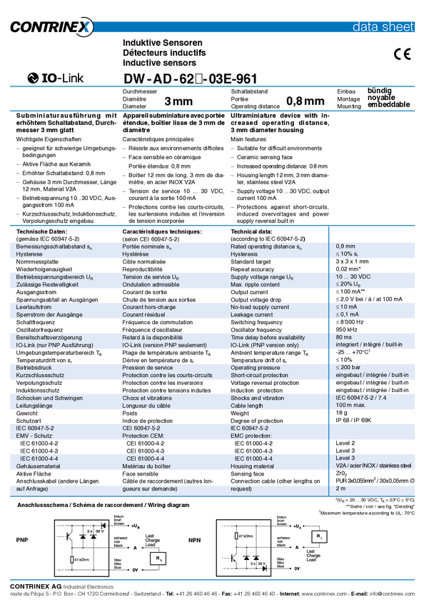 Czujnik indukcyjny Contrinex DW-AD-623-03E-961, 10 - 30 V, IP67/IP69K, 1 szt.