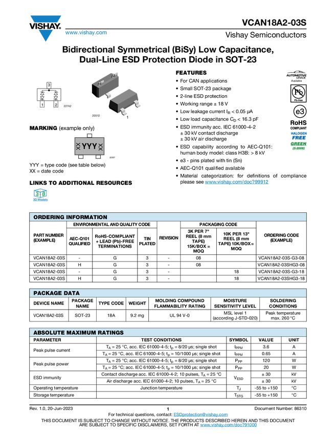 Bidirectional Symmetrical (BiSy) Low Capacitance, Dual-Line ESD Protection Diode in SOT-23