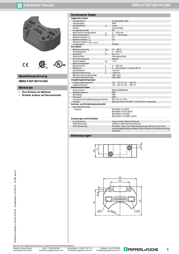 Pepperl+Fuchs Czujnik indukcyjny nie podtynkowy PNP NBN3-F25F-E8-Y41365