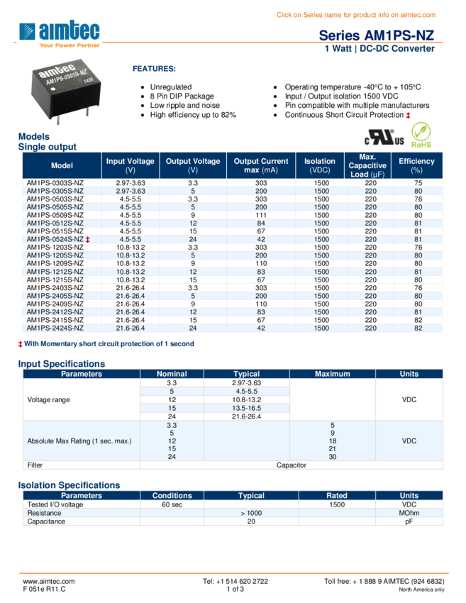 Module DC-DC 1-OUT 24V 0.042A 1W 4-Pin DIP