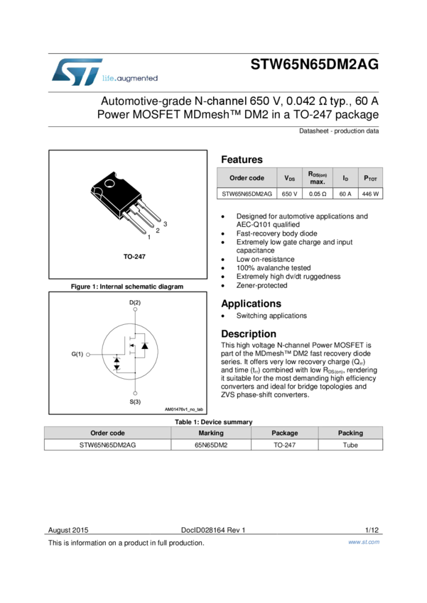 Automotive-grade N-channel 650 V, 0.042 Ohm typ., 60 A MDmesh DM2 Power MOSFET in a TO-247 package