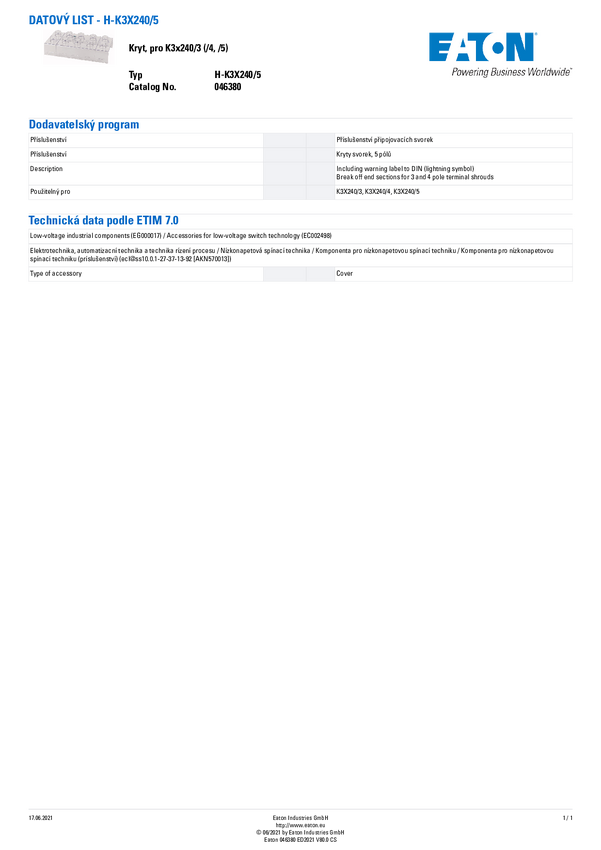 Pokrywa zacisków Eaton H-K3X240/5 046380, 1 szt.