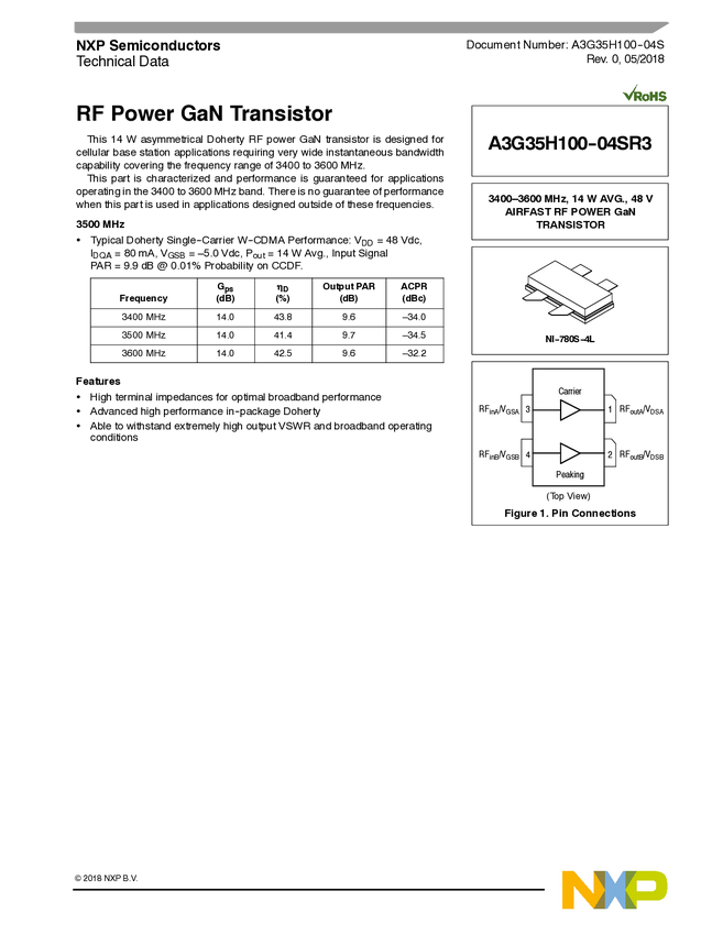 Airfast RF Power GaN Transistor, 3400-3600 MHz, 14 W Avg., 48 V