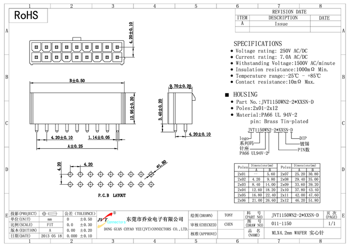 Wtyk; MLX5566-04; 4 tory; proste; 4,20mm; przewlekany (THT); 7A; 250V; zatrzaskowe; MLX 4,2mm.; = KWM4505-04S-C; JVT1150WN2-2x2SN-D; JVT; RoHS