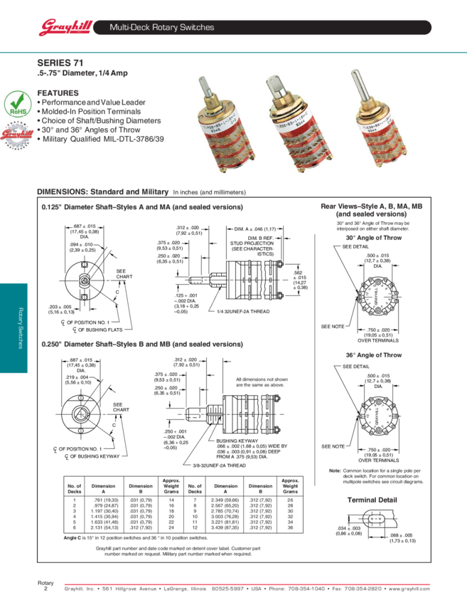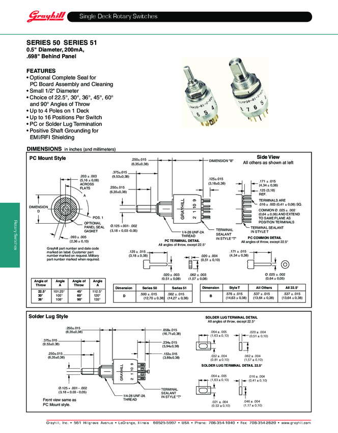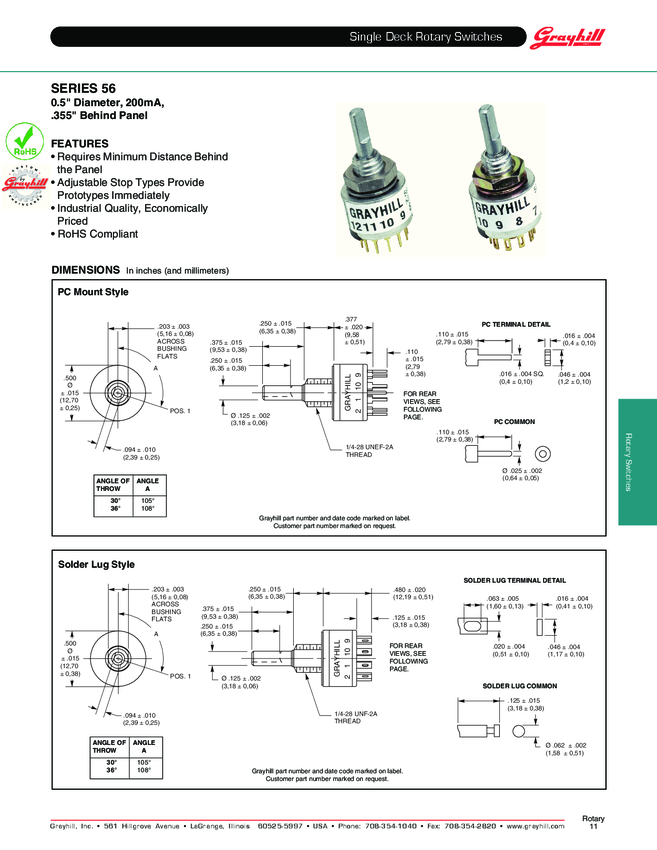 Switch Rotary SPDT 2 Flatted Shaft Solder Lug 5A 115VAC 28VDC