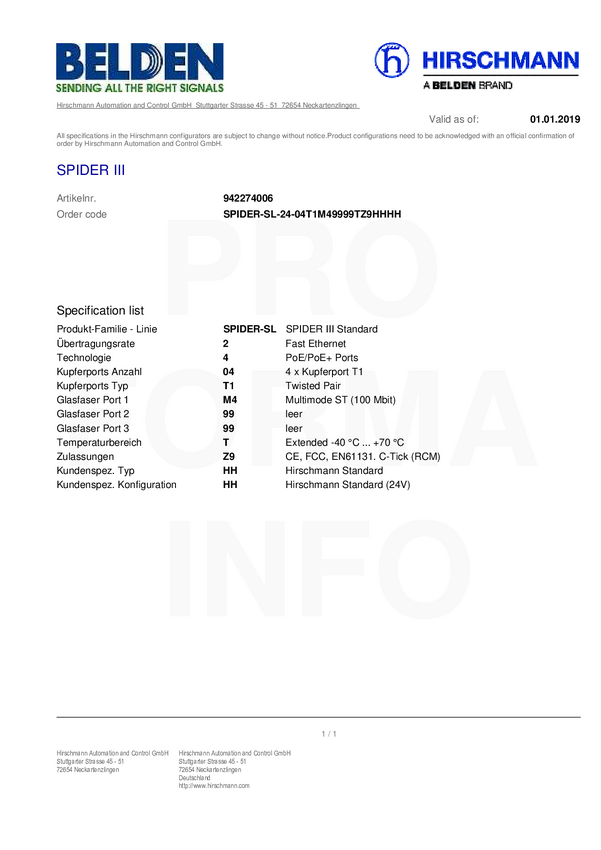 Switch przemysłowy Ethernet Hirschmann SPIDER-SL-24-04T1S49999TY9HHHH 942 274-008
