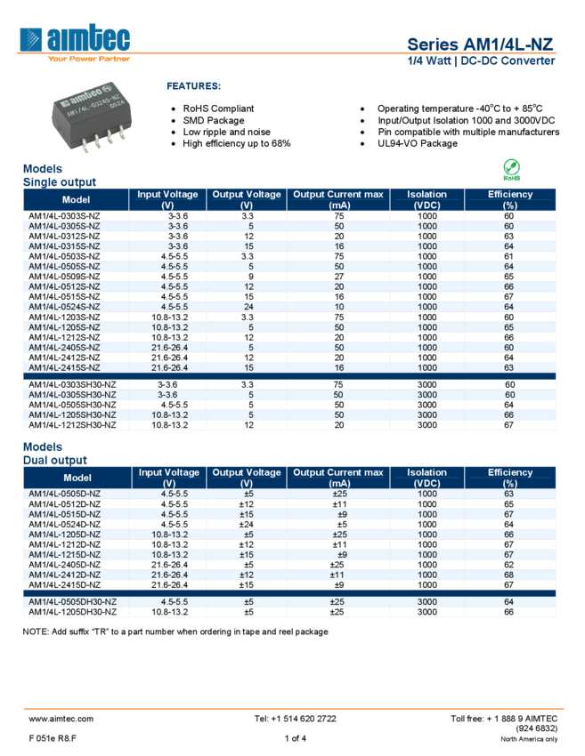 Module DC-DC 1-OUT 5V 0.2A 1W 4-Pin SIP Tube
