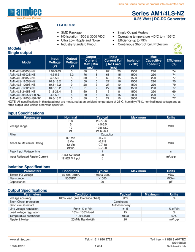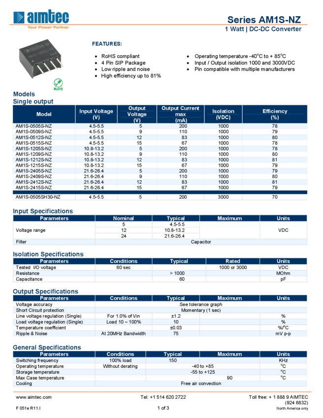Module DC-DC 1-OUT 12V 0.084A 1W 4-Pin SIP