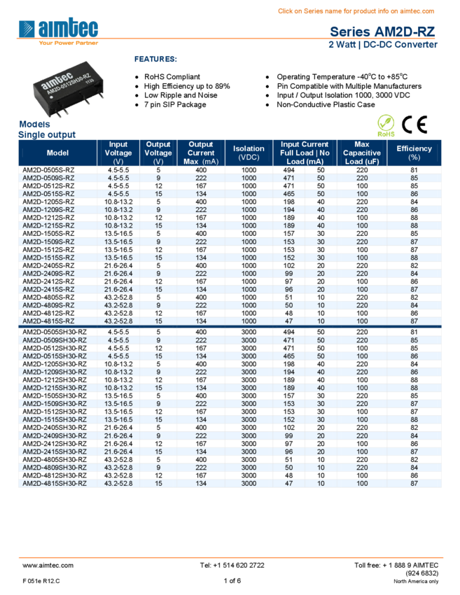 Module DC-DC 1-OUT 12V 0.083A 1W 6-Pin SIP Tube