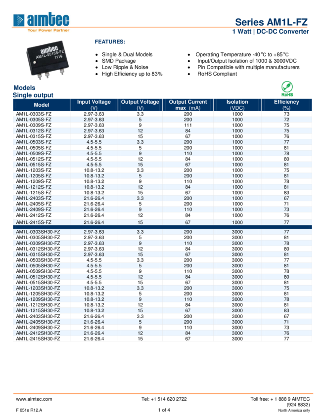 Module DC-DC 1-OUT 12V 0.167A 2W 4-Pin SIP