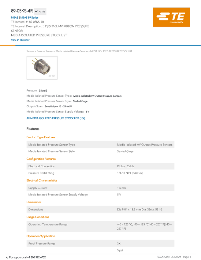 Pressure Sensor -0.05kPa to 0.05kPa Differential