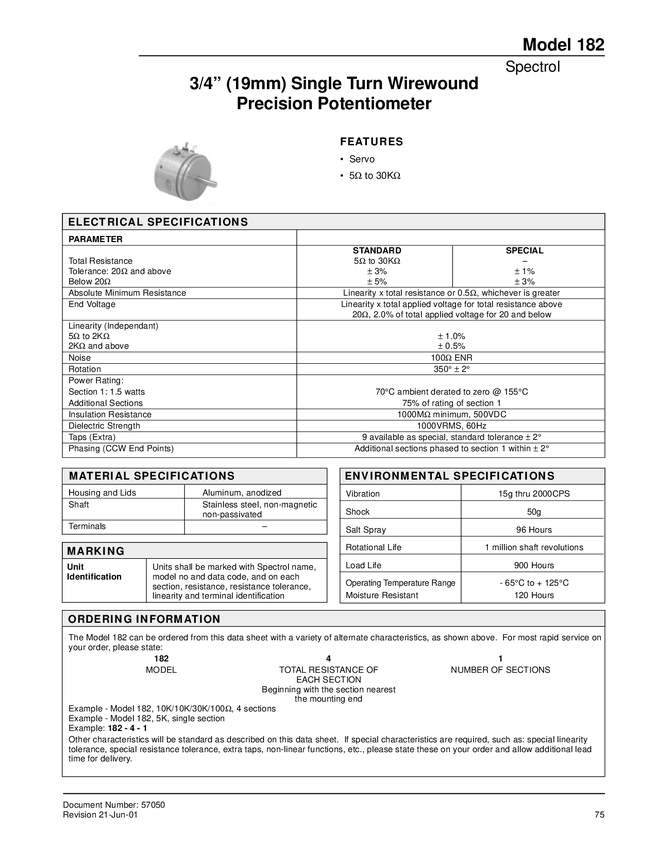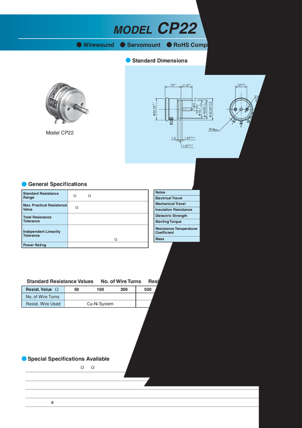 Potencjometr drutowy; Servo; lin 1%; tol. 3% 1 obrotowy; średnica 3/4"=19,05mm; ośka 1/8"=3,17mm trwałość 1.000.000 cykli; moc 1,5W