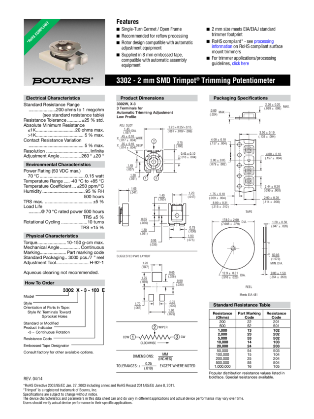 Res Cermet Trimmer 1K Ohm 25% 3/20W 1Turn (2.2 X 2.75 X 1.05mm) Foot Print SMD Carrier T/R
