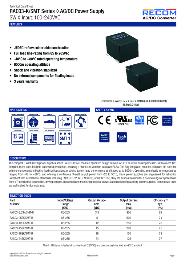 Zasilacz AC/DC RECOM RAC03-05SK/SMT-R 5 V 0.60 A 3 W