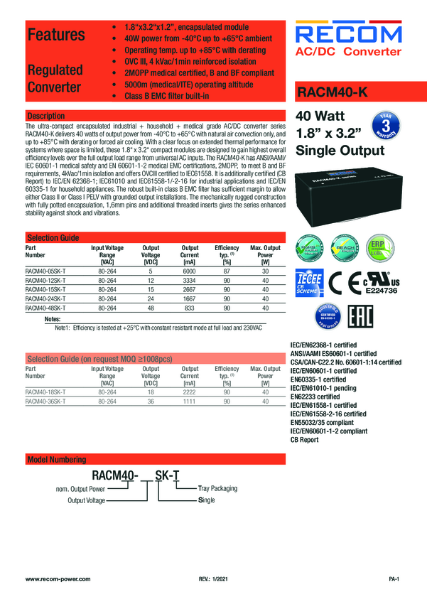 Zasilacz RECOM RACM60-05SK/277/OF 5 V 8 A 40 W