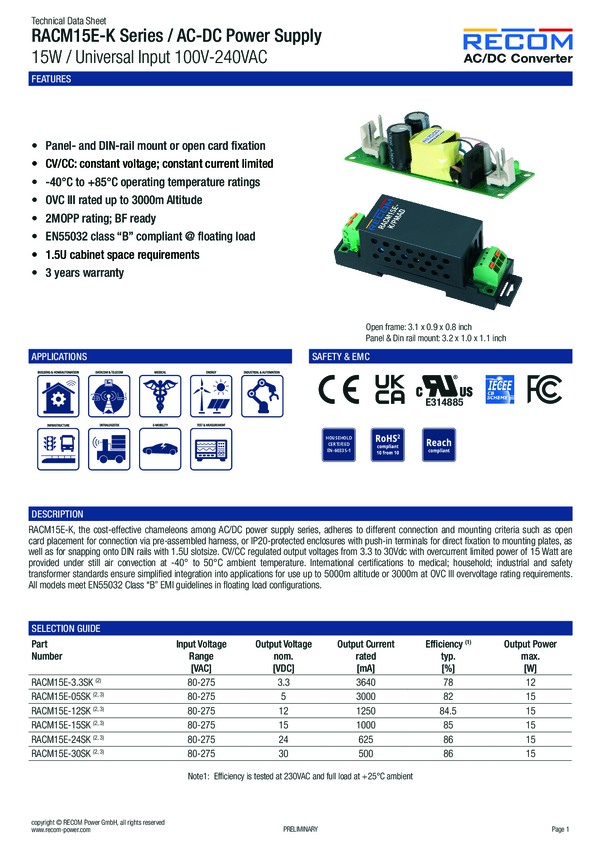 Moduł zasilacza AC/DC, open frame RECOM RACM15E-05SK/OF 5 V 3 A 15 W