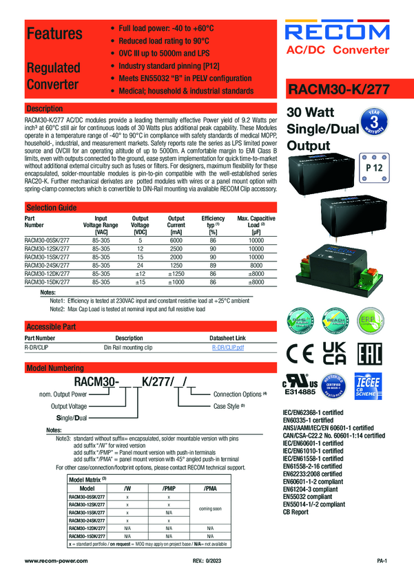 Zasilacz RECOM RACM30-05SK/277 5 V 6 A 30 W