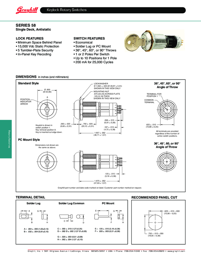 Switch Key Lock SP5T 36° Flat Key 0.2A 220VAC 30VDC Solder Lug Panel Mount
