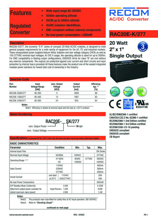 Zasilacz RECOM RAC20E-05SK/277 5 V 4 A 20 W