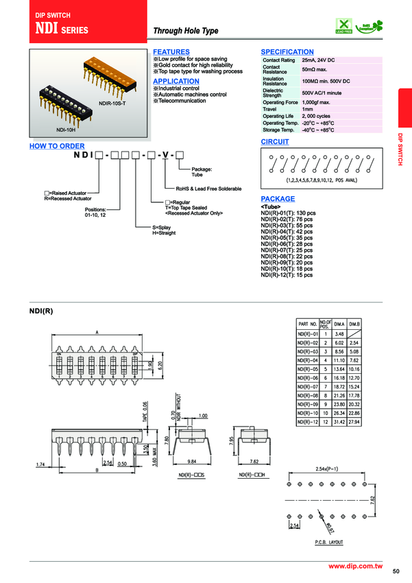 Switch DIP OFF ON SPST 5 Recessed Slide 0.025A 24VDC PC Pins Thru-Hole Tube