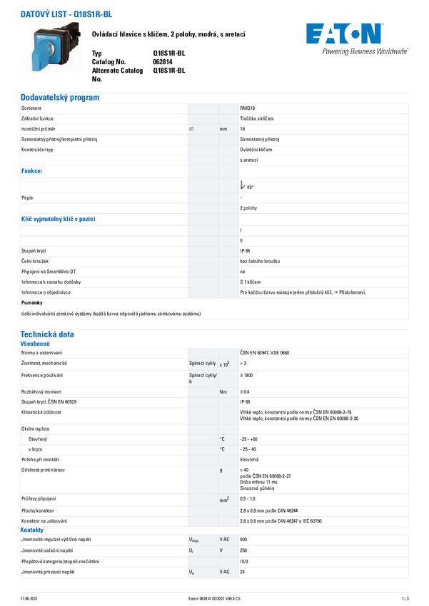 Eaton 062814 Q18S1R-BL Przycisk kluczykowy pierścień przedni z tworzywa sztucznego klucz niebieski 1 szt.
