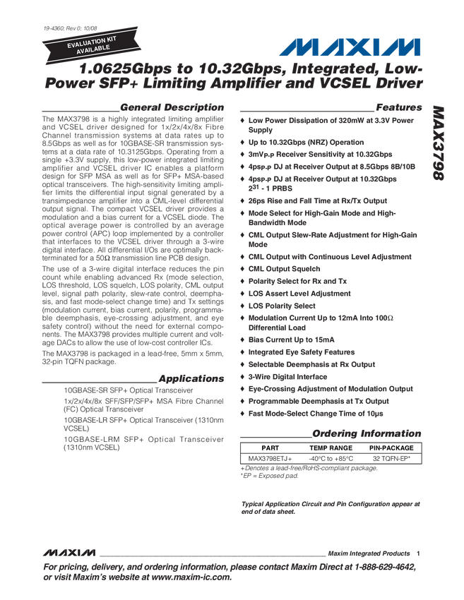 1.0625Gbps to 10.32Gbps, Integrated, Low-Power SFP+ Limiting Amplifier and VCSEL Driver
