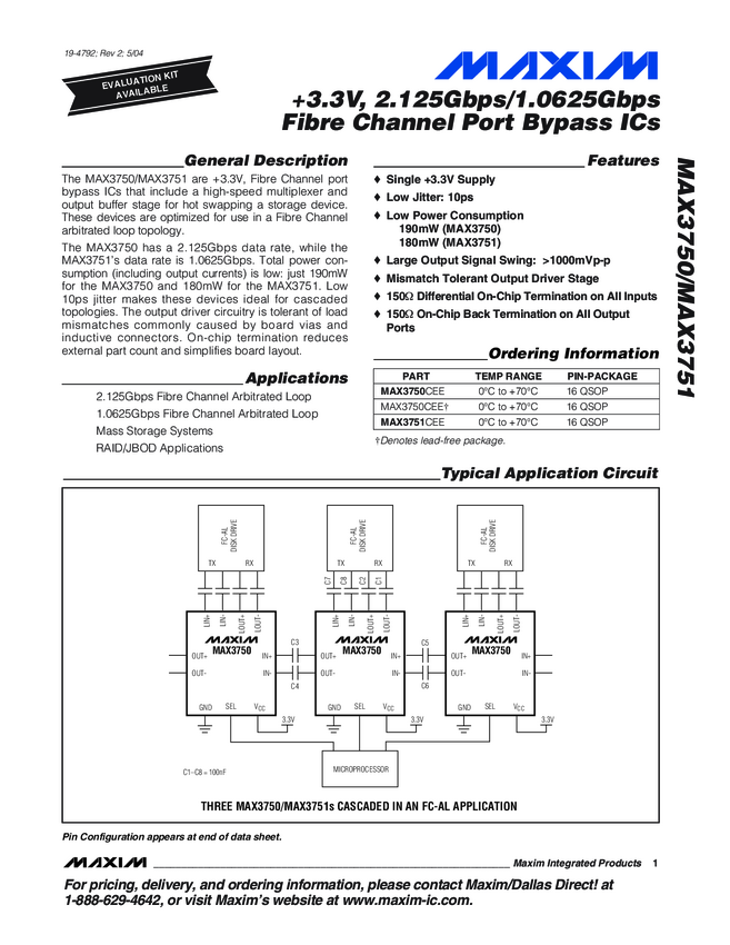+3.3V, 2.125Gbps/1.0625Gbps Fibre-Channel Port Bypass ICs