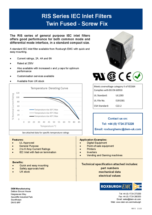 Power Line Filter 50Hz/60Hz 6A 250VAC Quick Connect Screw Mount
