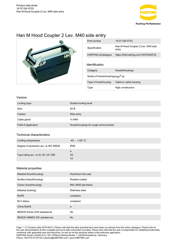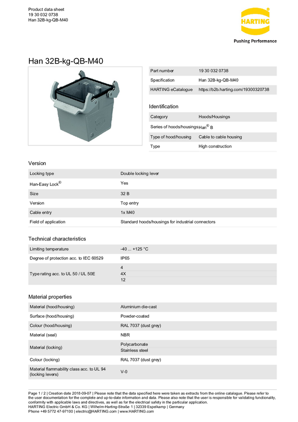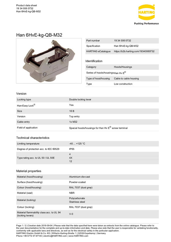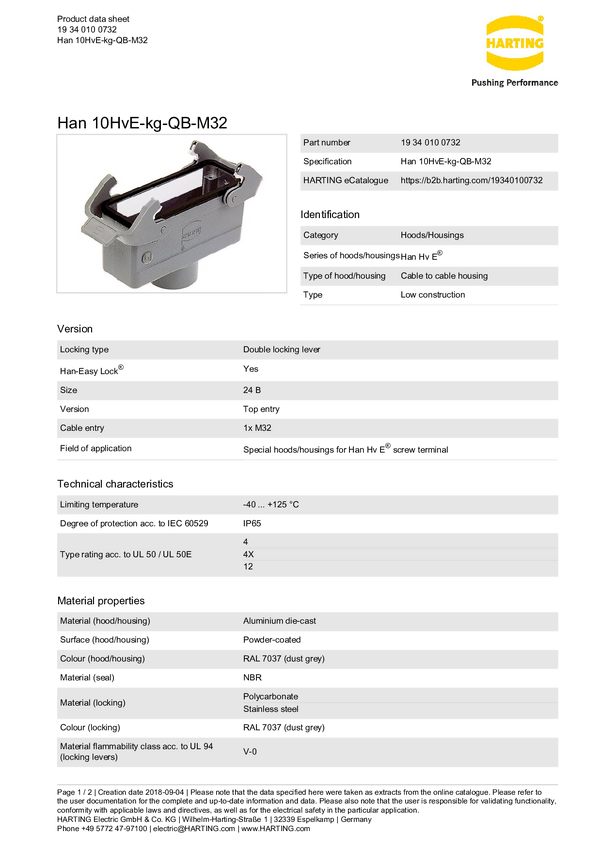 Obudowa złącza żeńskiego Harting 19 34 010 0732, odlew aluminium, 1 szt.