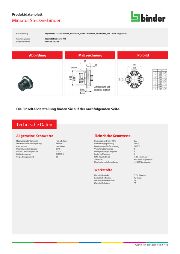 binder 09 0774 180 08 Złącze męskie okrągłe miniaturowe złącze żeńskie z kołnierzem Łączna ilość styków: 8 1 szt.