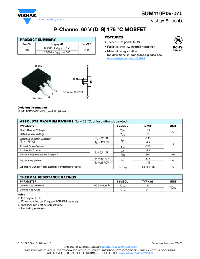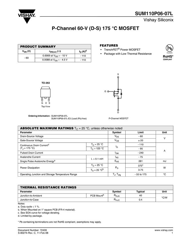 P-Channel 60 V (D-S) 175 °C MOSFET