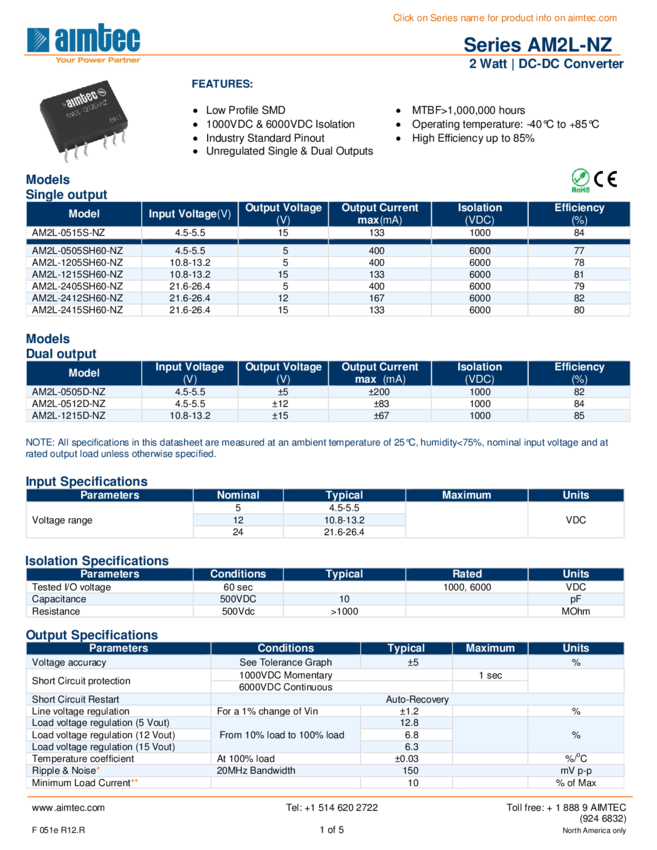Module DC-DC 2-Out 12V/-12V 0.083A/-0.083A 2W 5-Pin SMD T/R