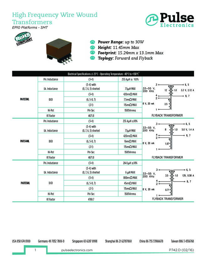 Power Transformer 1:0.083:0.208 1500Vrms Single+Auxilary Prim. Single Sec. 33V/57V/8V Prim. 3.3V Sec. Surface Mount