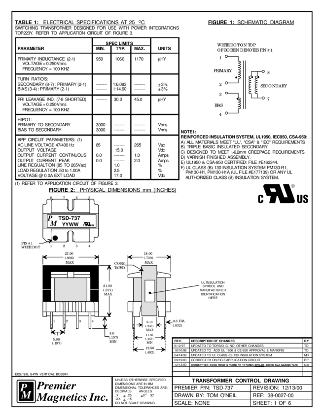 Power Transformer 6.083:1/14.6:1 Single+Auxilary Prim. Dual Sec. 265V Prim. 15V Sec. Through Hole