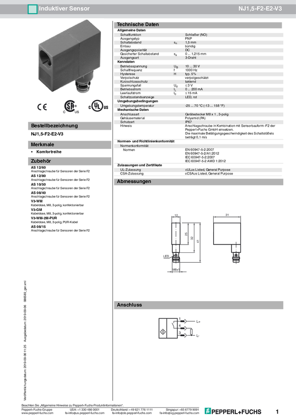 Pepperl+Fuchs Czujnik indukcyjny podtynkowy PNP NJ1,5-F2-E2-V3
