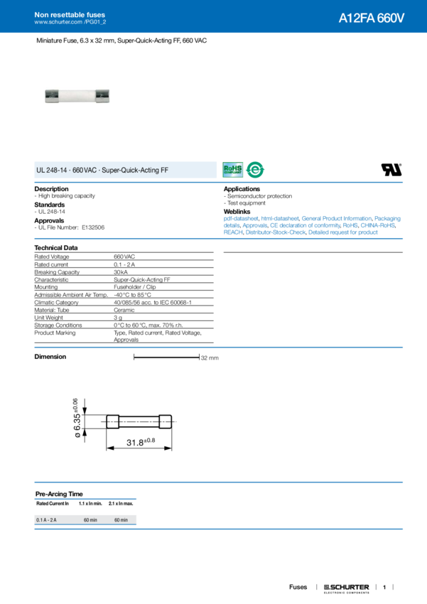 Fuse Miniature 1.25A 660V Very Fast 2-Pin Cartridge Holder Box