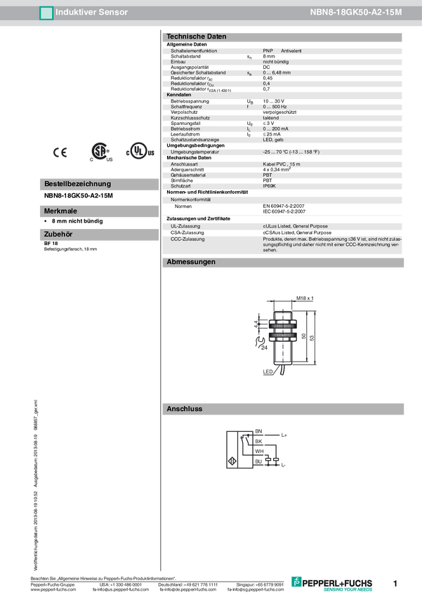 Pepperl+Fuchs Czujnik indukcyjny nie podtynkowy PNP NBN8-18GK50-A2-15M