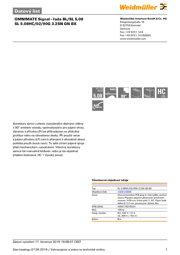 Weidmüller 1509170000 Obudowa złącza pin męskiego na PCB SL 5.08HC/02/90G 3.2SN GN BX, 100 szt.