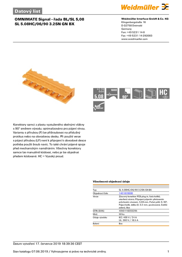 Weidmüller 1401930000 Obudowa złącza pin męskiego na PCB SL 5.08HC/06/180F 3.2SN GN BX, 42 szt.
