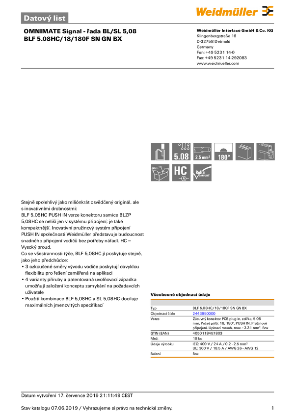 Weidmüller 2443950000 Obudowa złącza pin żeńskiego na kabel BLF 5.08HC/18/180F SN GN BX, 504 szt.