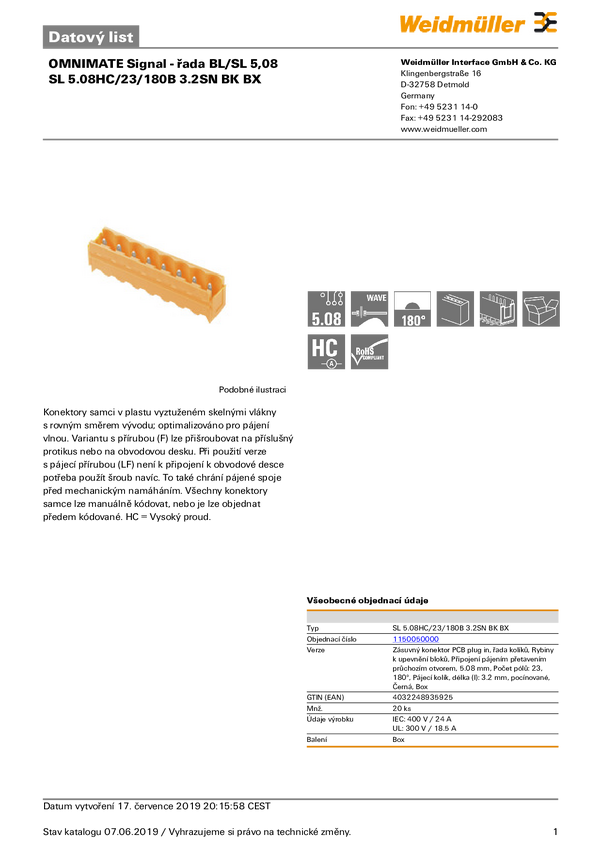Weidmüller 1149970000 Obudowa złącza pin męskiego na PCB SL 5.08HC/19/180B 3.2SN BK BX, 20 szt.