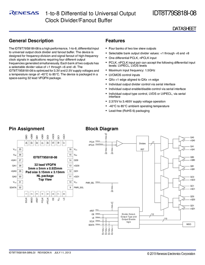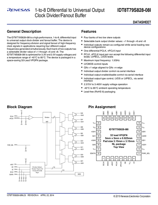 1-to-8 Differential to Universal Output Clock Divider/Fanout Buffer