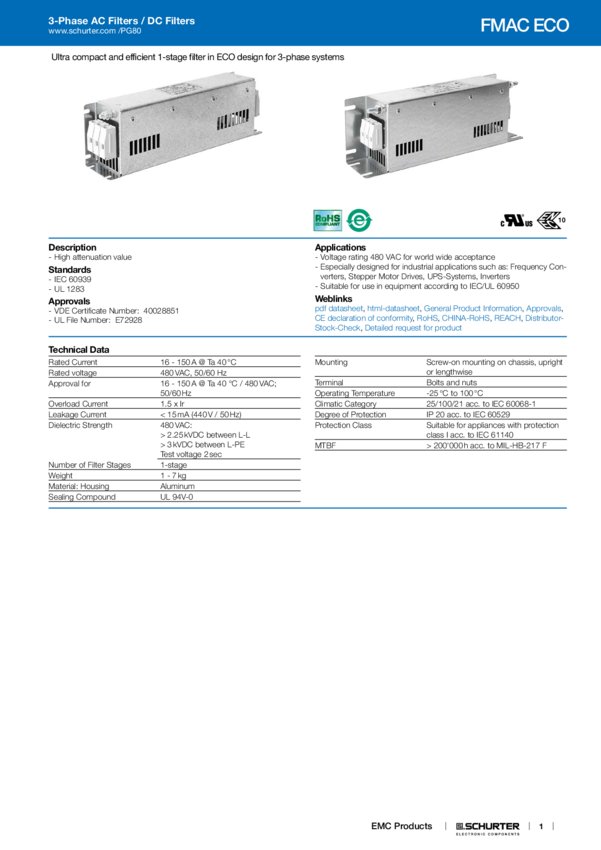 FMAC ECO FILTER 3PH 1ST 16A 480VAC
